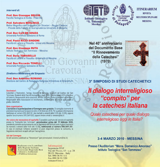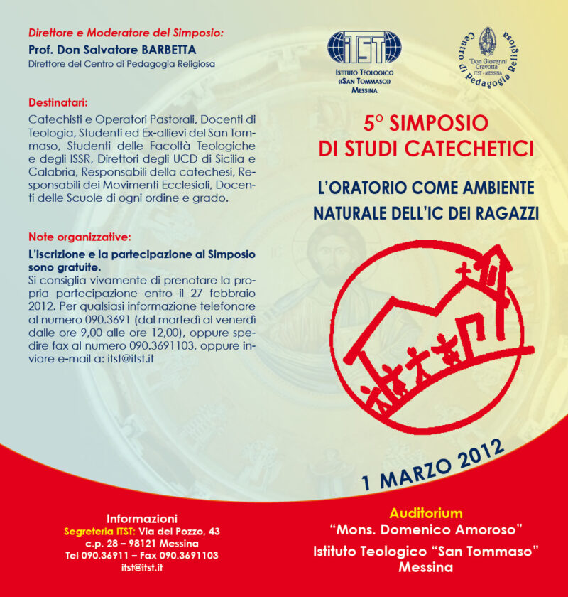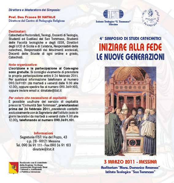 COSTRUIRE COMUNITA’ NELLA SCUOLADirettore del Corso: prof. Don Franco Di NataleMessina, 20-21-22 novembre 2008 Il Corso Nazionale è organizzato per Convenzione tra l’Istituto Teologico “S. Tommaso d’Aquino”, aggregato alla Facoltà di Teologia della Università Pontificia Salesiana, Roma e il Ministero dell’Istruzione, dell’Università e la Ricerca, Direzione Generale per la Formazione e l’aggiornamento della Scuola (MIUR, Roma) e gode di tutti i riconoscimenti giuridici (autorizzazione … Continua a leggere XII Corso Nazionale di aggiornamento degli insegnanti di Religione Cattolica