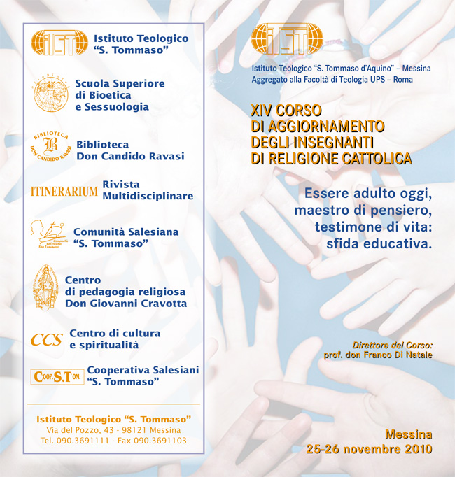 ESSERE ADULTO OGGI, MAESTRO DI PENSIERO, TESTIMONE DI VITA: SFIDA EDUCATIVADirettore del Corso: Prof. Don Franco Di NataleMessina, 25-26 novembre 2010 Il Corso Nazionale è organizzato dall’Istituto Teologico “S. Tommaso d’Aquino”, aggregato alla Facoltà di Teologia della Università Pontificia Salesiana, Roma e autorizzato dalla Conferenza Episcopale Italiana, Settore Scuola: Roma, 30 novembre 2009. Si rilascia attestato di partecipazione ai fini del punteggio interno dei singoli istituti scolastici.