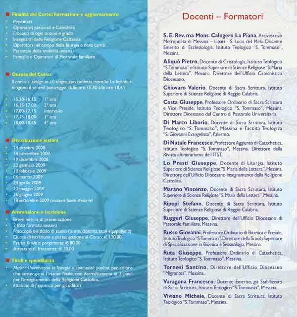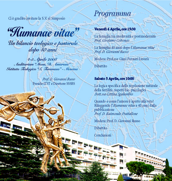 2 settembre 2014: Scade il termine per la presentazione delle domande di esami per la Sessione Autunnale 8-18 settembre 2014: Sessione Autunnale di esami 16 settembre 2014: esame conclusivo IV Anno 17-18 settembre 2014: Baccalaureato 29 settembre 2014, ore 09,00: Assemblea Docenti 29 settembre 2014, ore 11,00: Inizio Anno Accademico con celebrazione eucaristica 30 settembre 2014: Inizio lezioni I Ciclo 3 ottobre 2012: Inizio lezioni II Ciclo … Continua a leggere Calendario A.A. 2014-2015