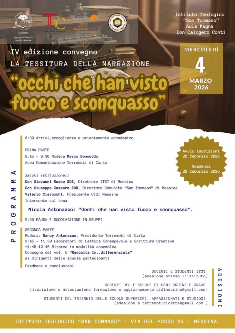 News 22 Febbraio 2026 aruello IV Edizione Convegno La Tessitura della narrazione “Occhi che han visto fuoco e sconquasso” – Mercoledì 4 marzo 2026, ore 08,30 Mercoledì 4 marzo 2026, ore 08,30 IV Convegno La Tessitura della narrazione